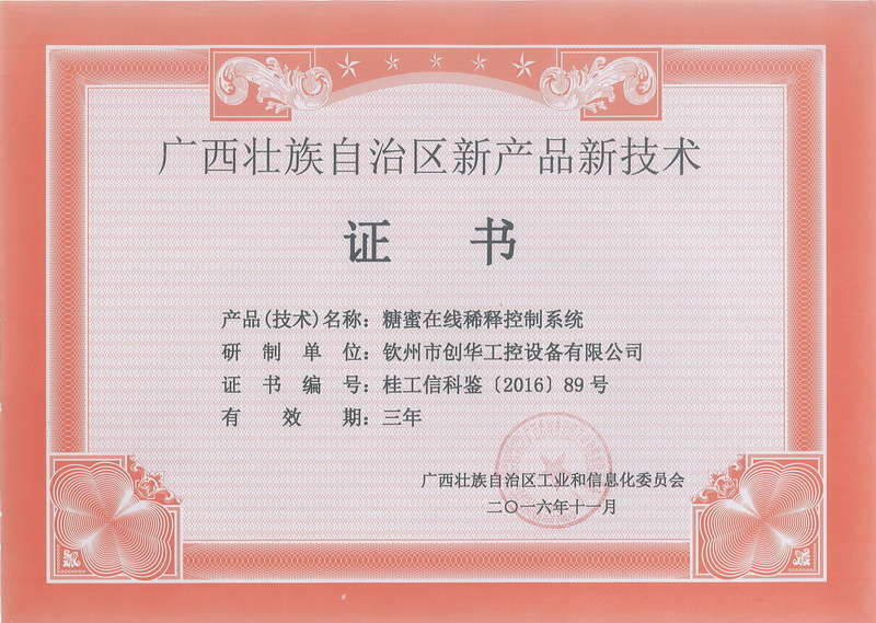 項目針對糖廠結晶工段糖蜜稀釋工序無法按需連續(xù)稀釋、溶晶不徹底、溫度波動大,影響產品質量和糖分回收的現(xiàn)狀,研發(fā)出“糖蜜在線稀釋系統(tǒng)”,實現(xiàn)了糖蜜稀釋過程中溶晶徹底,錘度和溫度有效控制,使結晶罐能做到沸點連續(xù)入料。項目產品“糖蜜在線稀釋系統(tǒng)”獲得廣西壯族自治區(qū)工業(yè)和信息化委員會委頒發(fā)的新產品新技術證書。